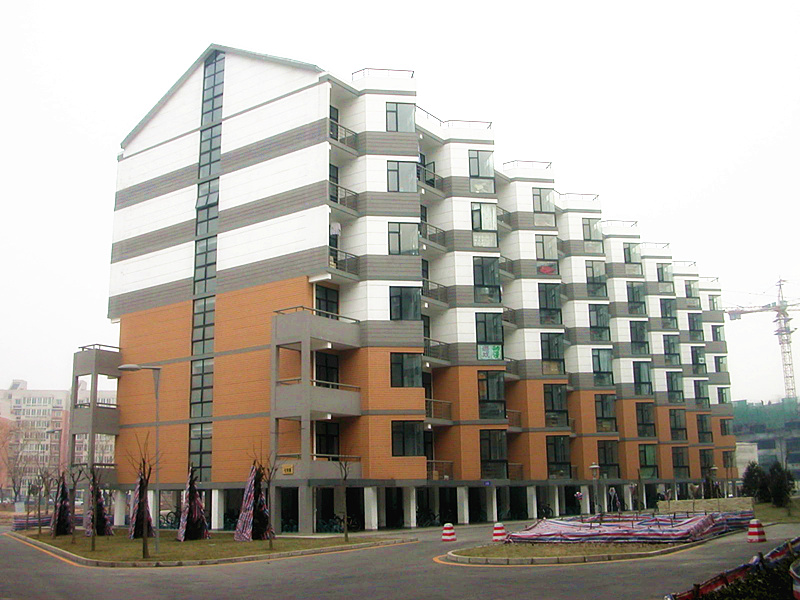 清華大學大石橋?qū)W生公寓,六層高約26米,建筑面積7000㎡。采用H型鋼柱,H型鋼梁,120厚壓型鋼板鋼筋砼樓板。外墻采用175厚NALC藝術(shù)板,鉤頭螺栓外掛式安裝;50厚NALC板防火包梁柱。